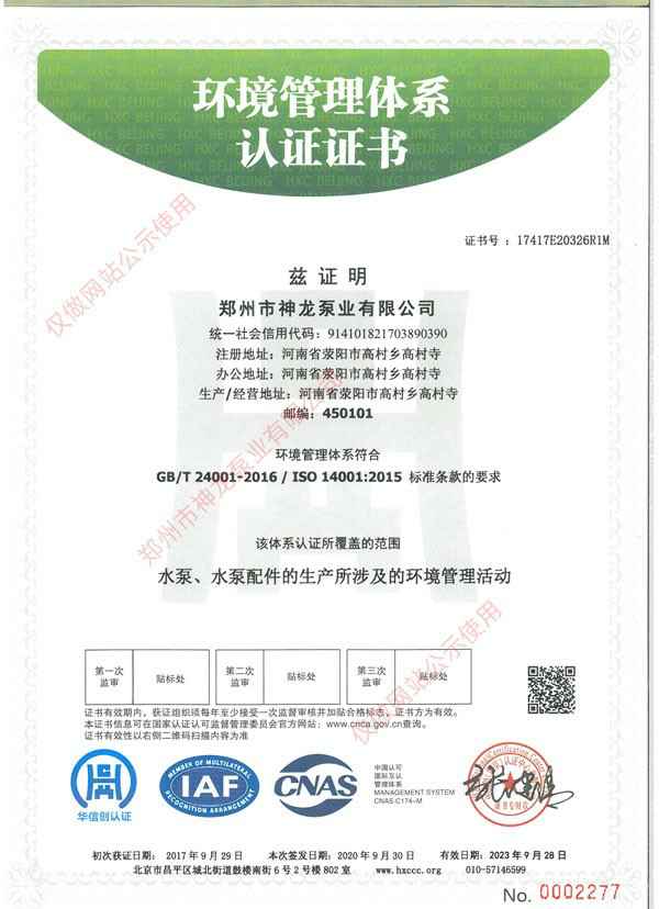 环境管理体系认证证书